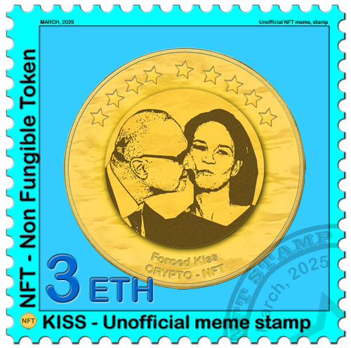 I dedicated this satirical UNOFFICIAL meme NFT to "When a politician kisses by force", satirical digital image created like meme Postage Stamp coin. Pixel dimension width: 1500 pix